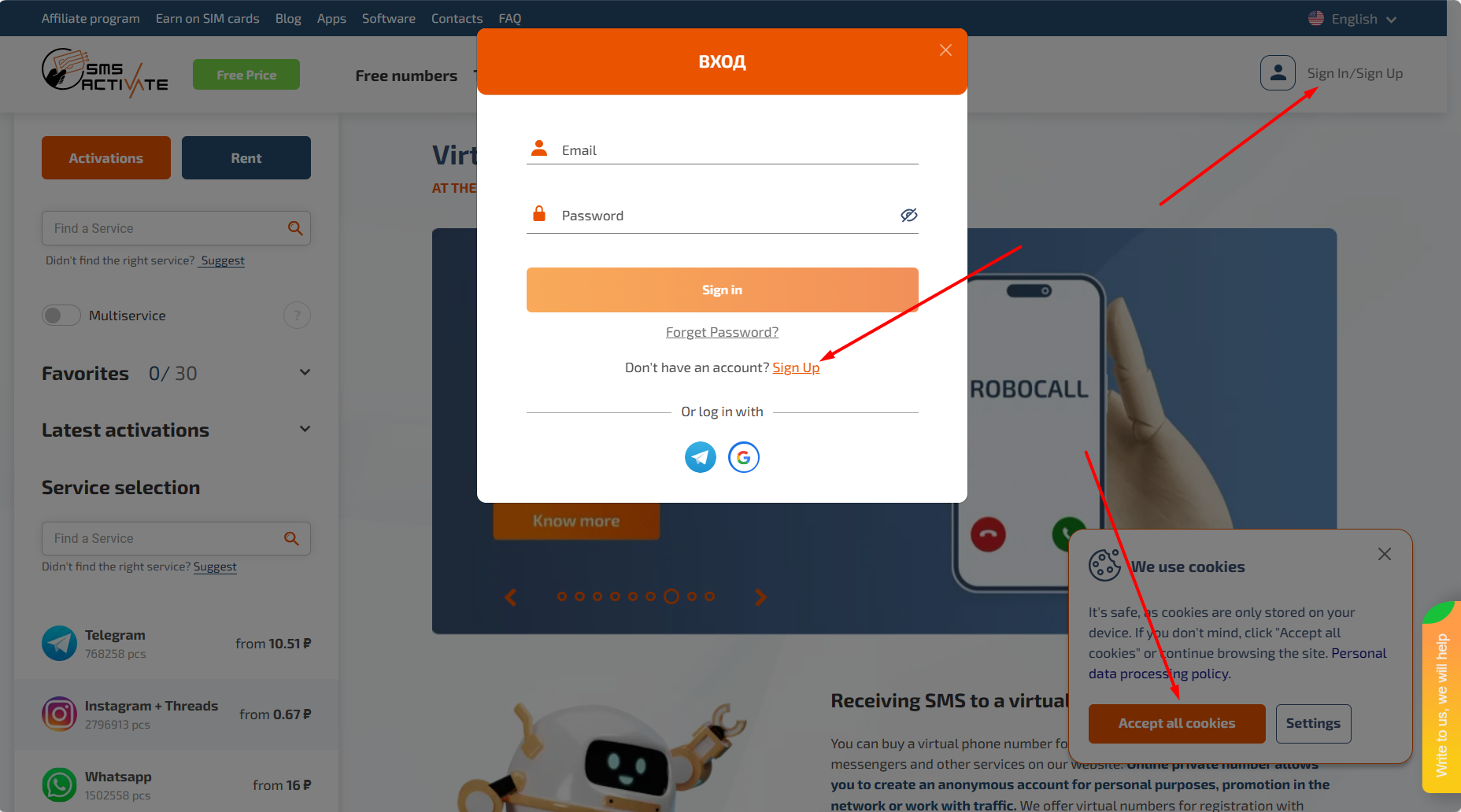 После успешного получения номера и идентификатора активации вам необходимо запросить СМС-код в окне регистрации вашего сервиса.